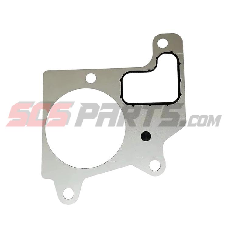 The thermostat housing gasket  is a seal that is used to prevent coolant leaks where the thermostat housing connects to the engine block. This gasket is typically made of rubber or cork and ensures a proper seal when the thermostat housing is bolted onto the engine. A faulty or worn out thermostat housing gasket can lead to engine overheating, loss of coolant, and potential damage to other engine components. It is important to replace this gasket if there are any signs of leakage or wear.